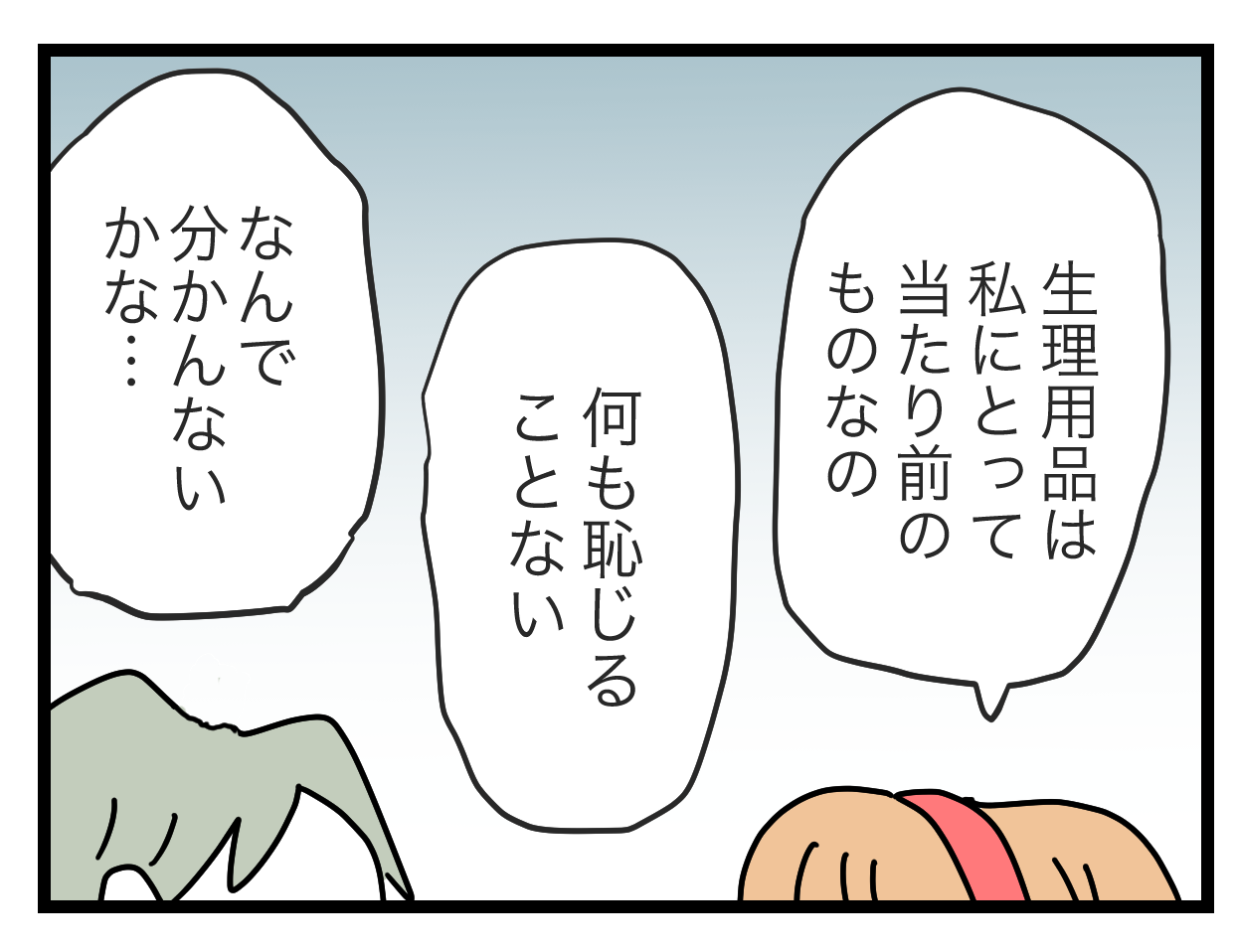 生理用品を恥ずかしがる女の子も多いけど、恥じるものではないと、学校で教えて欲しい。